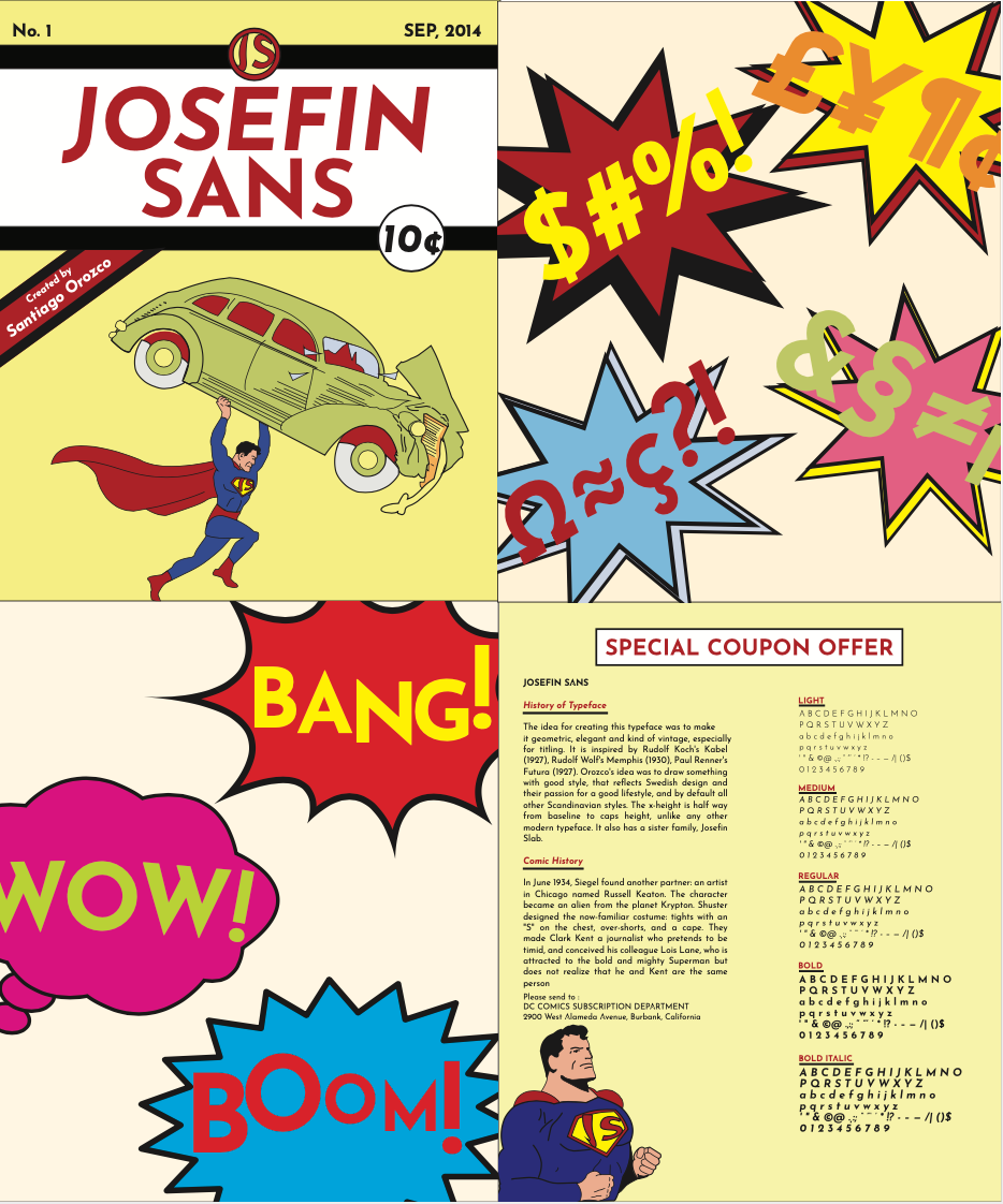 This project serves as a showcase for a selected typeface, which is Josefin sans, and the content is based on the theme of comic books, which was chosen by me.